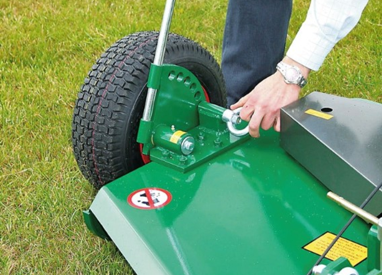 There’s a choice of cutting widths: 1.2m, 1.5m and 1.8m and the machines are fitted with side mounted wheels which allow ground contours to be followed accurately without scalping. If you need to mow close to a border or fence there is an optional rear wheeled machine available in 1.2m and 1.5m widths. You do need, however, to consider the towing vehicle has adequate capacity on the draw bar with the weight on the tow hitch greatly increased on rear wheeled machines. That said, there is a third wheel option which transfers the weight to the machines own wheels and leaves the towbar floating. The drawbar can be easily offset to one side to allow the cut to cover one wheel of the towing vehicle and all models feature three overlapping rotors to eliminate uncut strips of grass. The height of cut, between 25mm and 140mm, is easily set using the bar supplied to facilitate the operation of a spring-loaded pin and the bar is conveniently carried on the back of the mower. A turnbuckle on the drawbar also allows the machine to be levelled at any cutting height. Two Vee belts transmit the drive to the rotors via a centrifugal clutch, while the throttle lever is conveniently attached to the rear rack on a quad for easy reach from the riding position. There is no question these are tough and durable cutting decks with 5mm powder coated steel construction and rigid cutter bar blades, well suited to the type of work that has made them one of the most popular self-powered rotary mowers available.